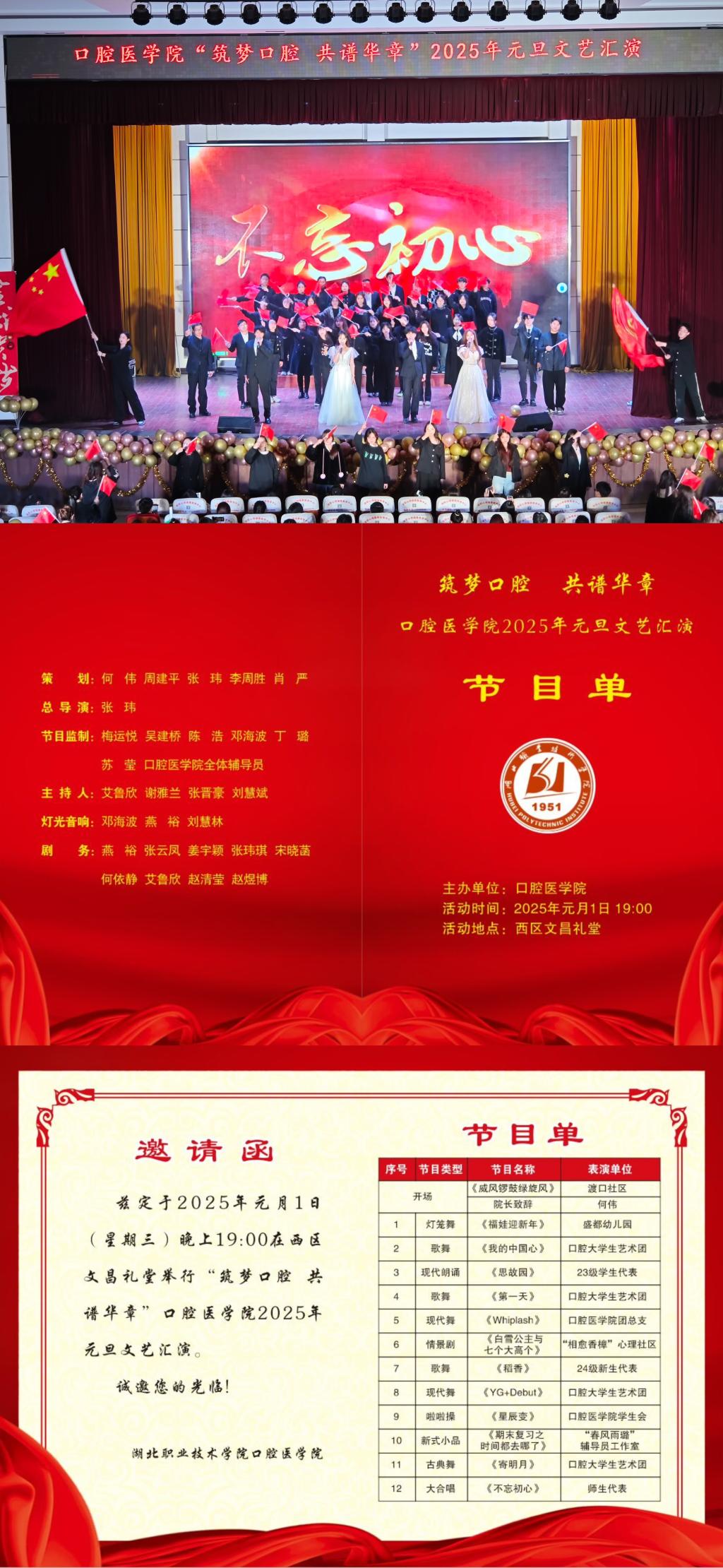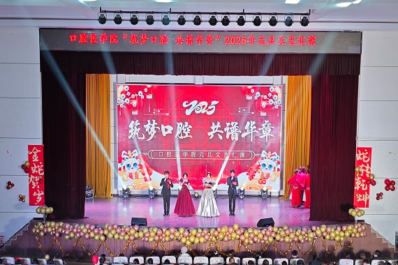 时光展新卷,岁月绘新篇。1月1日晚19:00,开云kaiyun官网“筑梦口腔 共谱华章”2025年元旦晚会在西区文昌大礼堂隆重举行。孝感市中心医院口腔中心主任黄卫东、孝感市口腔医院副院长余巍、院务委员董抗、医务科科长刘润芝、湖北盈瑞齿科总经理郑宝舟、新华街道渡口社区主任郭强、盛都幼儿园执行园长汪群、学校相关职能部门、各教学院领导莅临晚会现场。学院班子成员、全体师生共同观看演出。
