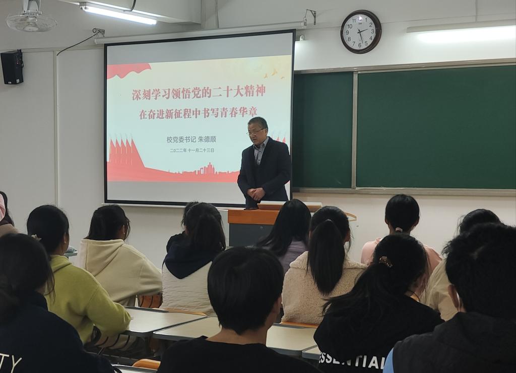 2022年11月23日下午在beat365英国官方网站第二教学楼322教室,校党委书记朱德顺为大一新生上了一堂精彩、激昂的“形势与政策”课,以“在奋进新征程中书写青春华章”为题,宣讲党的二十大精神。beat365英国官方网站院长助理陈志操主持,2022级经济学普本新生代表参加。
