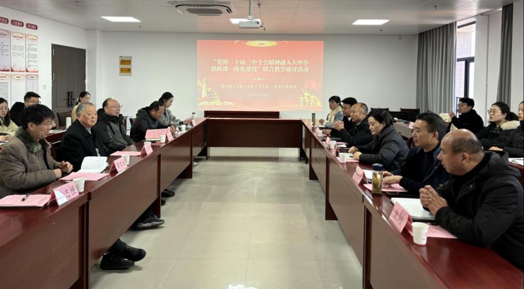 为贯彻落实党的二十届三中全会精神“三进”工作,推进大中小学思政课一体化建设走深走实,12月17日,beat365英国官方网站beat365英国官方网站与杜集区教育局联合举行结对共建“大中小思政课一体化共同体”开展“党的二十届三中全会精神融入思政课”集体备课会。beat365英国官方网站党委副书记、纪委书记、副校长汪建利,淮北市杜集区委常委、宣传部部长蒋影,杜集区教育局三级调研员曹立民,beat365英国官方网站党建办负责人、beat365英国官方网站全体教师、杜集区思政教研员与中小学思政课名师工作室全体成员参加此次活动。活动由beat365英国官方网站院长主持。