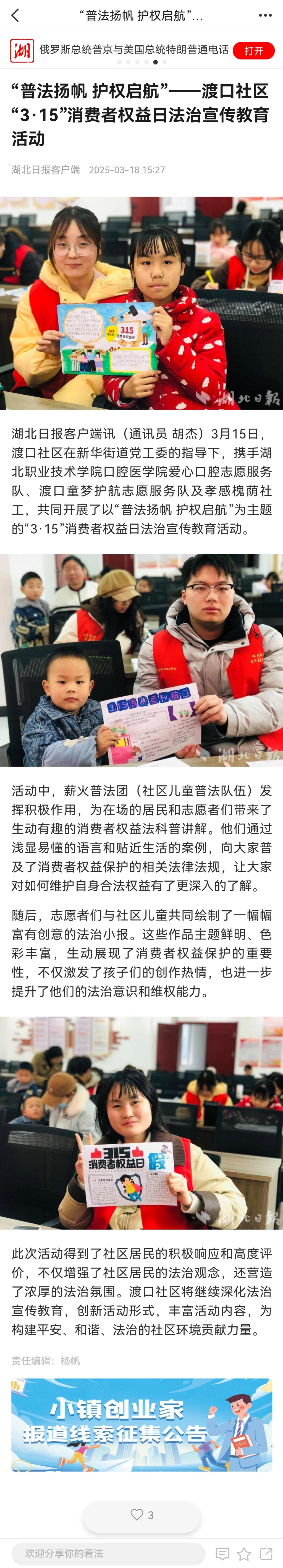 【湖北日报客户端】“普法扬帆 护权启航”——渡口社区“3·15”消费者权益日法治宣传教育活动