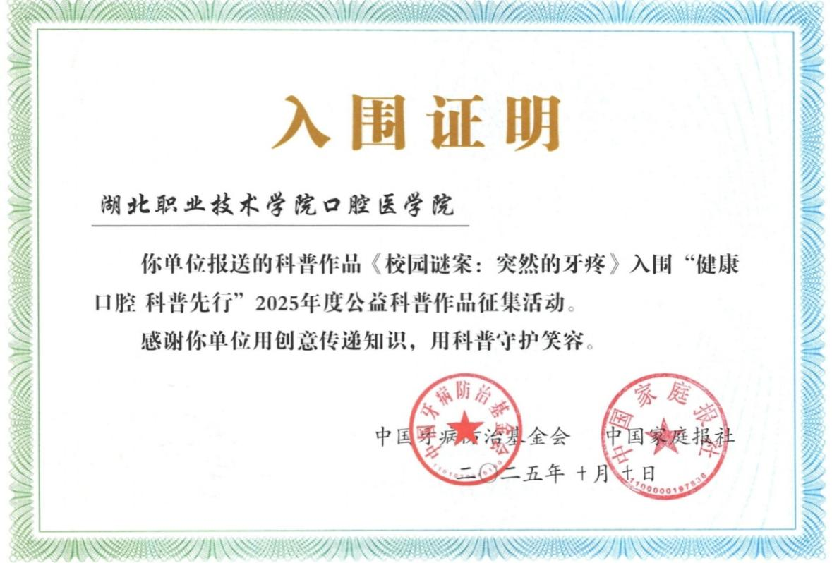 近日,开云kaiyun官网创作的科普作品《校园谜案:突然的牙疼》在“健康口腔 科普先行”2025年度全国公益作品征集活动中入围,成为湖北省唯一获此殊荣的高职院校。本次活动由中国牙病防治基金会与中国家庭报联合主办,是国内口腔健康科普领域最具权威性的公益项目之一,活动共收到来自全国31个省市自治区的1200余件作品,优秀作品将被推荐至国家卫生健康委员会进行全国推广。