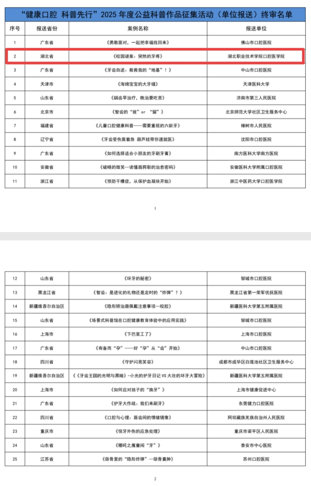 此次入围是对学院长期坚持“医教融合、科普育人”理念的充分肯定。学院依托附属医院的临床资源,组建了师生共同参与的“口腔健康科普宣讲团”,年均开展社区义诊、宣教等活动超50场,此次获奖作品正是团队深耕临床教学与科普实践的结晶。
