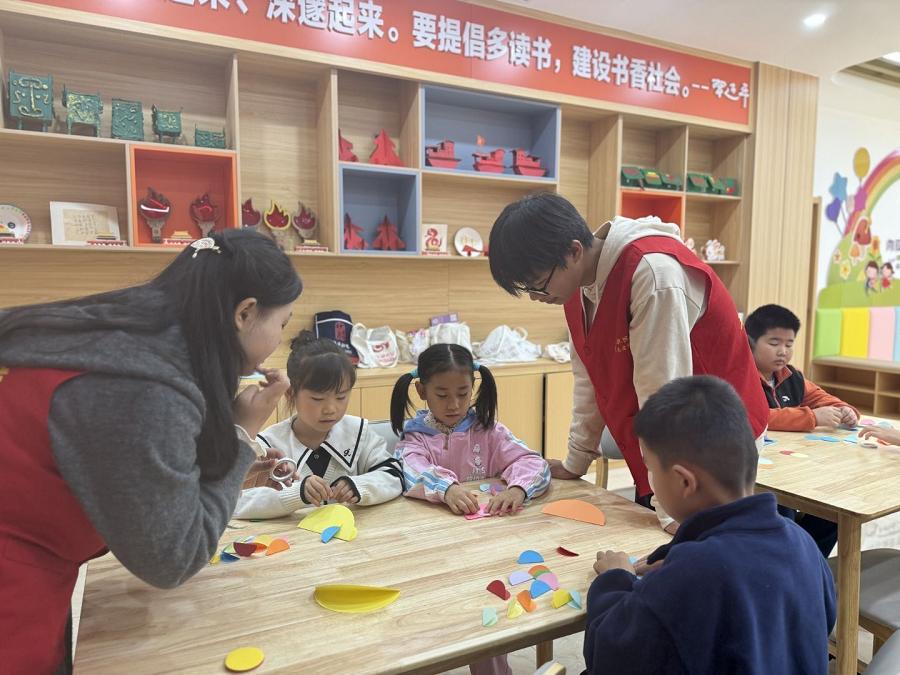 科普环节结束,最受期待的手工制作开始。志愿者为每个孩子分发彩色卡纸、剪刀、胶水等材料,带领大家制作“摇摇鱼”。他们一边示范折剪、粘贴步骤,一边俯身指导动作较慢的孩子。有小男孩不小心掉落剪刀,志愿者立刻上前捡起,温柔教他正确握法;还有孩子因粘不好鱼眼睛着急,志愿者蹲在身旁,陪着他一点点调整位置。不久后,形态各异、色彩鲜艳的摇摇鱼接连完成,孩子们捧着作品,脸上满是成就感。