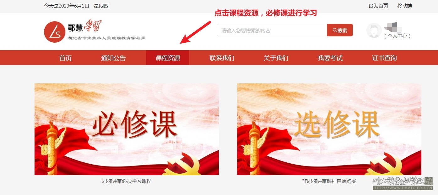 1.学员登录后就进入在线学习平台,点击“课程资源”中的“必修课”。