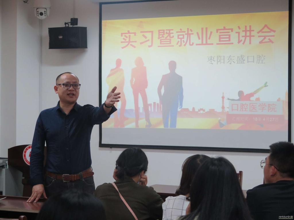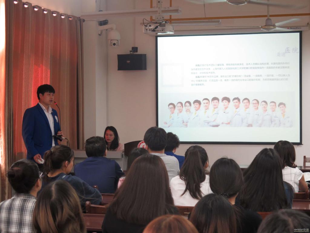 宣讲会伊始,肖主任首先对宣讲嘉宾表示了热烈的欢迎,随后,两家医院代表分别对学生的实习需求、招聘与选拔方式等进行了详细的宣讲,同时结合自己的工作经历分享了他们的就业经验。温岭口腔医院负责人说到,当今医疗形势严峻,社会对医务人员的要求也越来越全面,只有文凭是不够的,应聘者还需具备良好的综合素质,真正做到理论与实践结合,才能更好地适应今后的工作。枣阳东盛口腔医院主讲人还向在场学生详细解读了行业情况,深度分析口腔医学需求类型排名以及医院对于实习人才的需求分析,对我院毕业生的实习就业具有实际的指导意义。