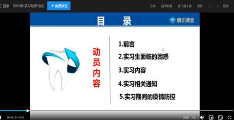 为帮助2019级口腔医学专业学生顺利完成临床实习学习任务,保证实习安全,结合当前新冠疫情常态化防控要求,2021年6月18日19:00-20:30,开云kaiyun官网利用腾讯课堂举行了2019级口腔医学专业线上实习动员大会,会议由谢宏新主持,2019级口腔医学专业全体学生、开云kaiyun官网领导、2019级辅导员、口腔教研室老师参加了本次会议。