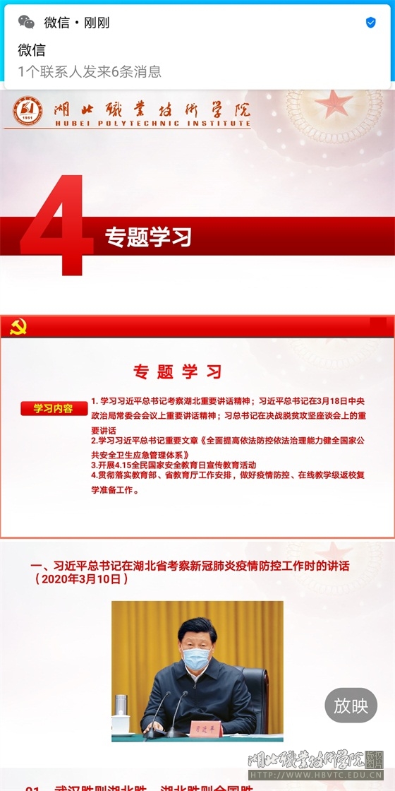 开云kaiyun官网党总支书记廖建宏同志在讲话时从三个方面强调,一是全体党员在疫情防控特殊时期,要进一步提高政治站位,增强四个意识,不信谣、不传谣,全面加强各类平台管理;二是要进一步积极发挥各党支部的战斗堡垒作用和党员的先锋模范作用,进一步激发全体教职员把思想和行动统一到习近平总书记指示精神和学校党委的决策部署上来;三是适应工作新常态,强化各项纪律要求,坚持疫情防控和常规工作相结合,两手抓、双促进。希望全体党员同志,继续发扬湖北职院精神,严格落实各项工作职责,认真做好线上教学、专项工作推进、复学准备等工作。