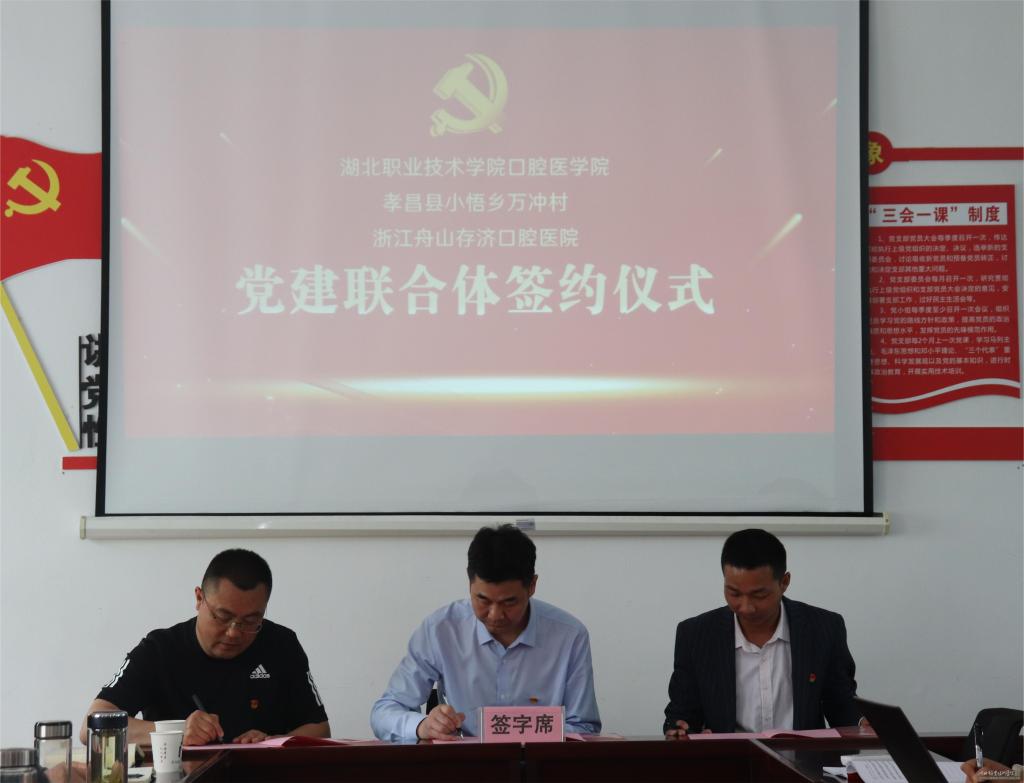 为创新基层党建工作载体,提高基层党建工作水平,汇聚各方力量积极落实三育人主体责任,4月14日,开云kaiyun官网党总支、孝昌县小悟乡万冲村党支部及浙江舟山存济口腔医院党支部在万冲村堂群服务中心举行校地企党建联合体签约仪式,小悟乡党委委员、副乡长刘颖主持活动。