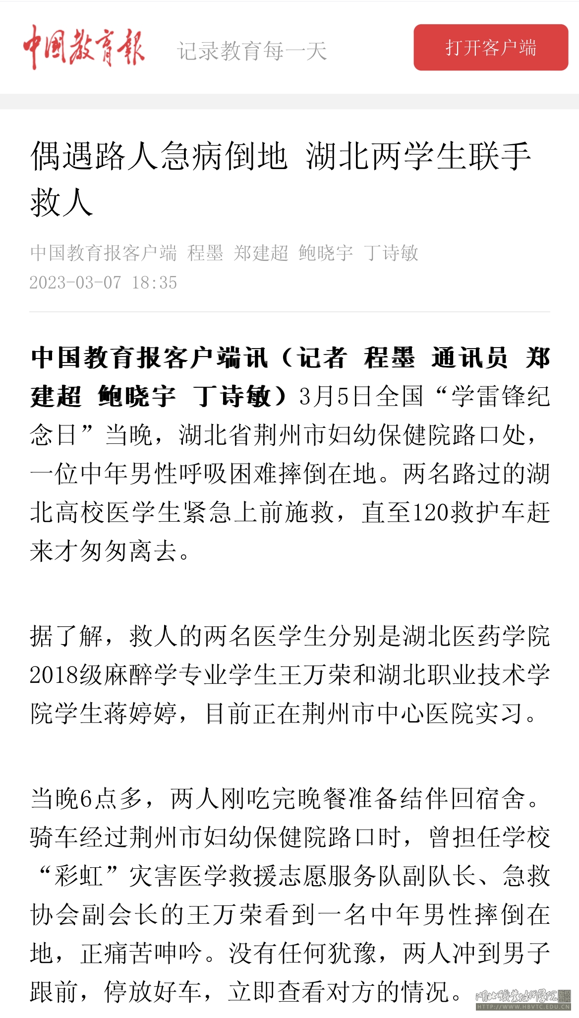 据了解,救人的两名医学生分别是湖北医药学院2018级麻醉学专业学生王万荣和开云kaiyun官网学生蒋婷婷,目前正在荆州市中心医院实习。