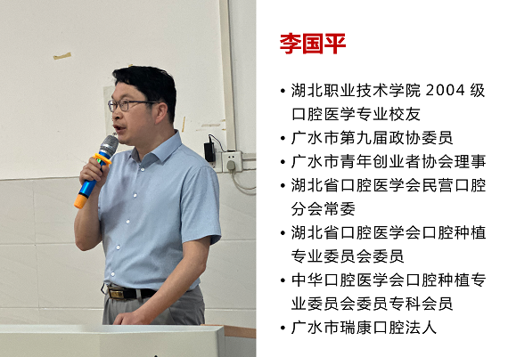 讲座中,李国平校友回顾了自己从初入职场到在家乡自主创业的历程。同时,也分享了自己多年来一直在做的相关公益事业。之后,结合多年临床实践经验,以口腔医生的起点、选择、理想与信念以及个人职业规划等多方面,向在场学弟学妹们分享了自己的见解与观点,使大家对专业学习、职业发展有了更加深入的认识。同时,李国平校友对学弟学妹们也提出了殷切期望,希望大家努力学习专业知识、磨练自身意志、提高专业技能,善于抓住每一次学习的机会,通过理论学习和临床实践经验来提升自己的综合能力,不断践行与发扬知行合一、求真务实的医学精神。最后,李国平校友表示,在以后的创业道路上他会始终怀着对家乡无比热爱的赤诚之心,热情地投入到家乡社会的建设之中,继续坚持以人为本、诚信经营,把公司做大做强,进而带动更多的人才创业就业。希望用自己的一丝微薄之力,为社会做出力所能及的贡献。未来的瑞康口腔将与青创协会一起,带动更多的年轻人一起创业,给他们提供更大的扶持创业帮助,实现他们共有的梦想。