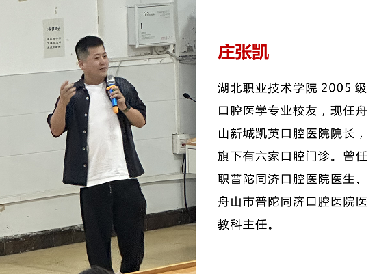 讲座中,庄张凯校友深情表达了对母校、老师的思念和感激之情,他回忆起自己大学三年成长、工作经历、职业规划与心得,向大家分享在校的学习规划、生活碎片以及任职学生干部时的成长经历和发展经历。这些经历都为其日后实现自己目标奠定良好基础。毕业后,在体制内公立医院工作了几年,积累的经验让他判断民营医院和私人诊所应该是未来口腔医疗行业的大趋势。所以,在2015年11月,他自主创业,在舟山新城创办了自己的第一家口腔门诊——凯英口腔门诊部有限公司。之后本人多次前往德国、荷兰等国家游学,2016年加入中华口腔医学会口腔正畸专业和口腔种植专业委员会。2018年10月在舟山普陀又创办了尚美口腔门诊部有限公司。现在凯英口腔在业界已小有名气,由最初的社区性质的牙科诊所,发展到具有国内先进水平的全数字化口腔诊所。在事业发展同时,他也热情招揽母校学生,为他们提供实习基地及就业机会,悉心培养口腔人才。