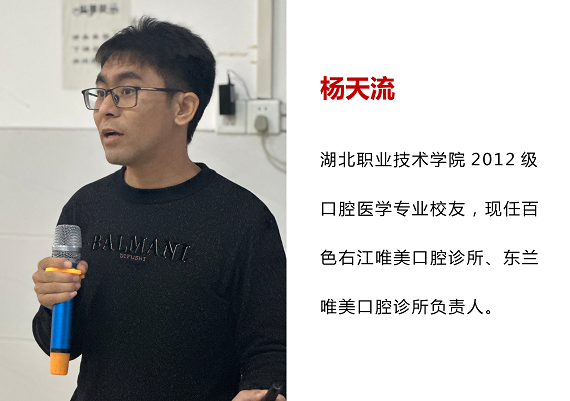 分享过程中,杨天流回想往昔,数度落泪。他说,在那段我人生的黑暗期,感谢母校和我的实习医院,给予了我和我的家人在精神和物质上非常大的支持。在我幸运的获得肾源,完成手术后,我更加迫切的想要成功。2017年,杨天流踏上创业之旅,开始以承包的形式正式经营医院口腔科。2019年创办了自己的第一家口腔门诊——百色右江唯美口腔诊所,2022年又创办了东兰唯美口腔诊所。